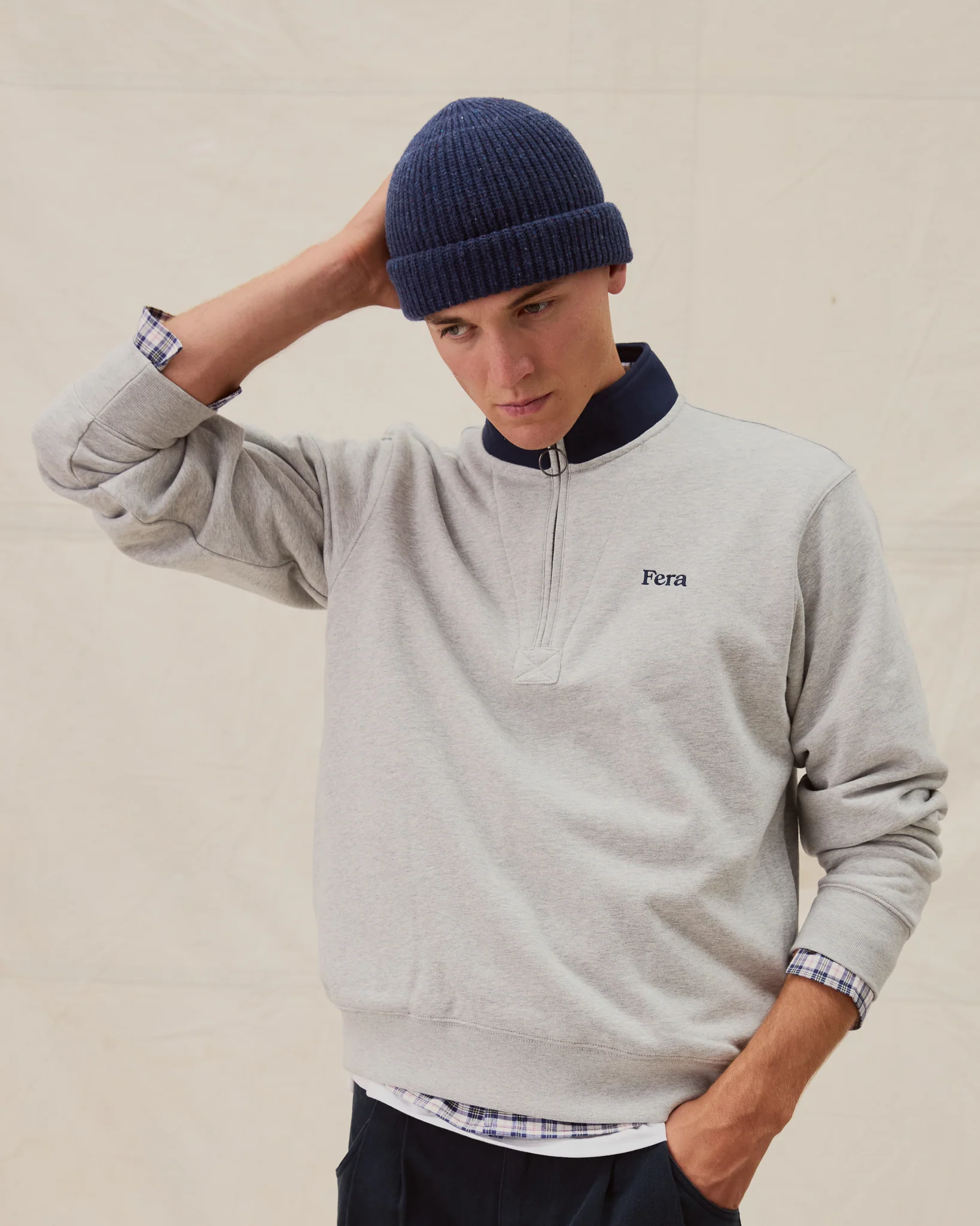 Inspired by vintage army training kit, the Quarter Zip is made from a soft loopback jersey. Features include contrast collar, hidden inseam pockets, ribbed hem and cuffs, and the Fera logo embroidered on the left chest.